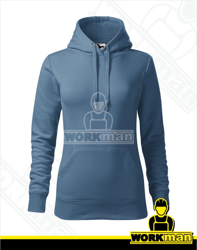 Popis: Dámska mikina s kapucňou. Nakladané vrecká v štýle klokanky na prednom diele. Kapucňa s podšívkou, na stiahnutie šnúrkou. Spodný lem a manžety rukávou z rebrového úpletu 2:2 s 5 % elastanu. Vnútorná časť priekrčníka začistená tkanou páskou. Zúžený strih.