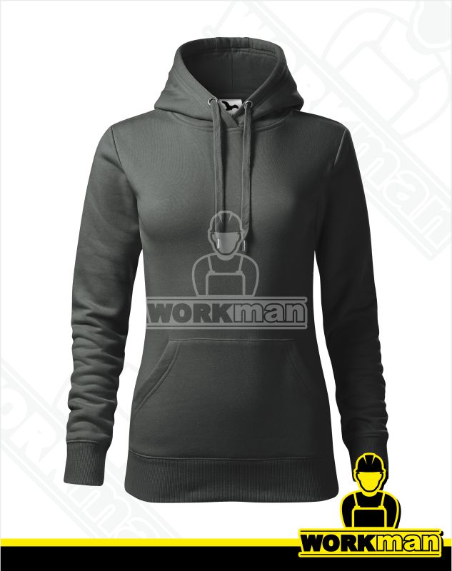 Popis: Dámska mikina s kapucňou. Nakladané vrecká v štýle klokanky na prednom diele. Kapucňa s podšívkou, na stiahnutie šnúrkou. Spodný lem a manžety rukávou z rebrového úpletu 2:2 s 5 % elastanu. Vnútorná časť priekrčníka začistená tkanou páskou. Zúžený strih.