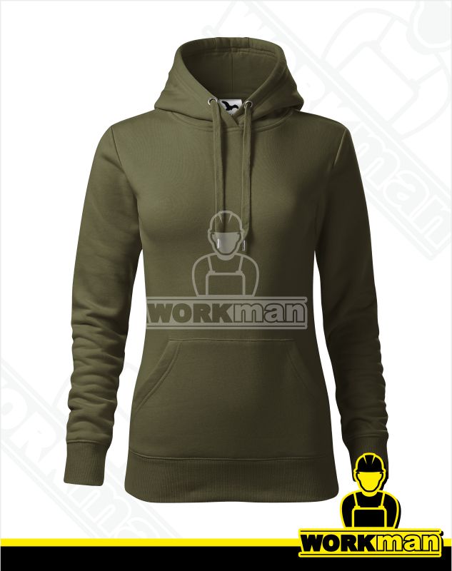 Popis: Dámska mikina s kapucňou. Nakladané vrecká v štýle klokanky na prednom diele. Kapucňa s podšívkou, na stiahnutie šnúrkou. Spodný lem a manžety rukávou z rebrového úpletu 2:2 s 5 % elastanu. Vnútorná časť priekrčníka začistená tkanou páskou. Zúžený strih.