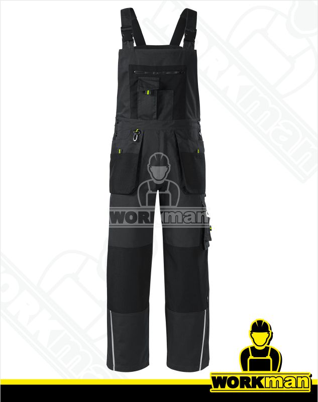 Popis: Retroreflexná páska v dolnej časti nohavíc. Multifunkčné vrecká, 14 vreciek. Zapínanie na gombíky v bočnej časti. Pútko na kladivo. Nohavice s nastaviteľnými trakmi zapínanými na plastovú sponu. Elastické traky. CORDURA® použitá v kontrastnej farbe. Dvojté prešitie pre vyššiu odolnosť.