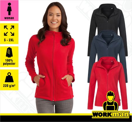 Popis: Dámska mikina z mikro fleece s úpravou proti plstnateniu. Priedušná, obojstranne počesaná, postranné švy. Výstužná keprová lemovka za krkom. Celoprepínací zips rovnakej farby s vnútornou krycou légou. Zadné sedlo, stojací golier a 2 bočné vrecká. Nastaviteľný spodný lem so sťahovacou šnúrkou a zarážkami. Prať na 40 °