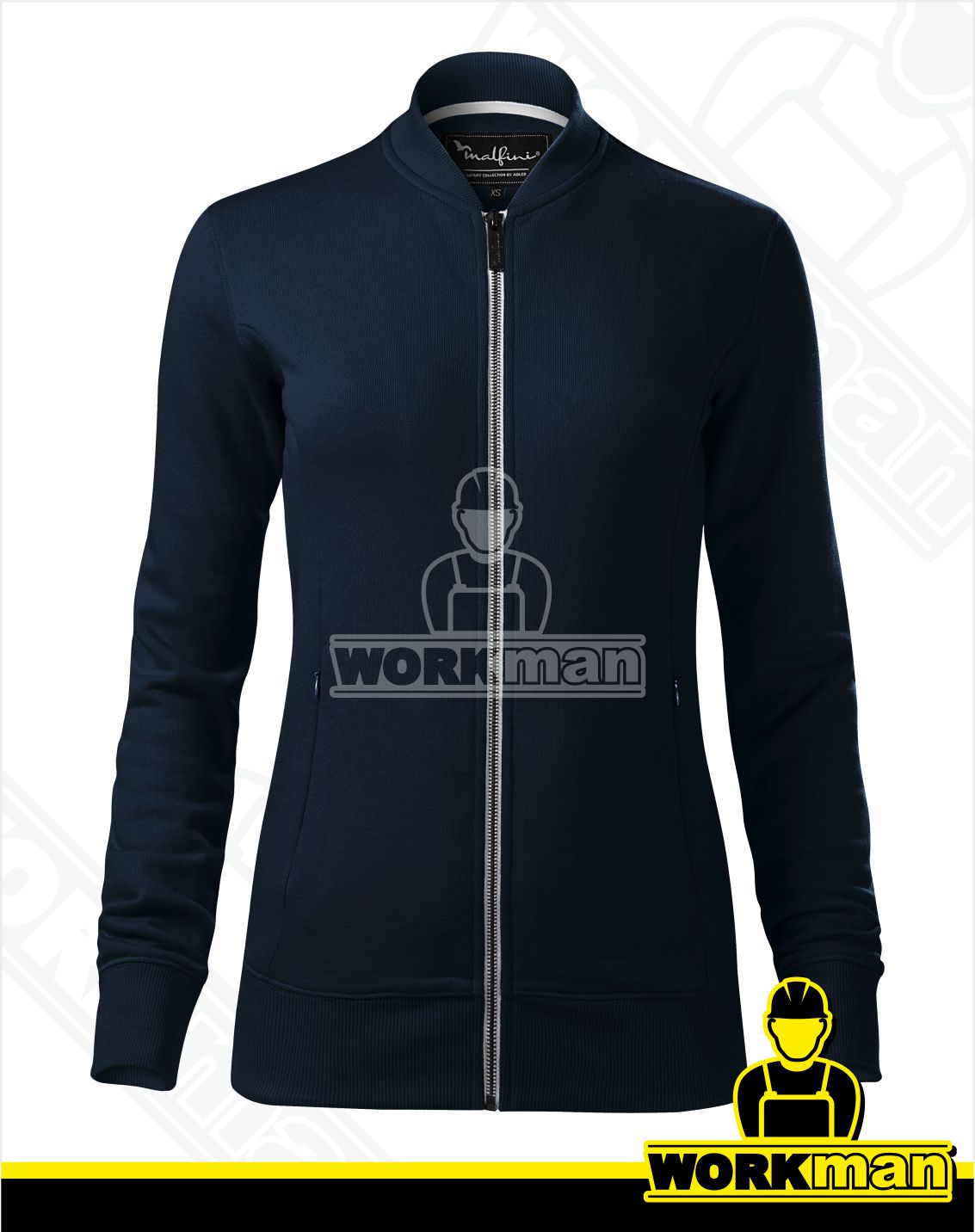 Popis: Dámsky strih ležérnej celozapínacej mikiny v štýle "bomber" s kontrastnými prvkami. Rebrovaný stojačik s elastanom 2:2. Kovový zips ozdobený Malfini logom. Vrecká v členiacich švoch so skrytým zipsom. Spodný lem a manžety rukávou z rebrového úpletu 2:2 s 5 % elastanu.