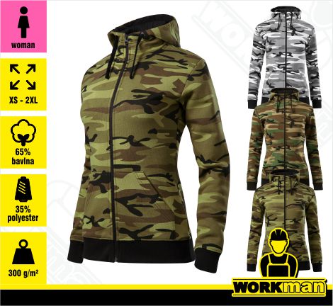 Kompletné špecifikácie Dámska mikina CAMO ZIPPER Malfini Pánsku variantu mikiny CAMO ZIPPER nájdete TU.   Popis: Dámska celozapínacia mikina s kapucňou. Zľahka vypasovaný strih s bočnými švami. Celozapínací reverzný špirálový zips. Kapucňa s podšívkou, na stiahnutie šnúrkou. Vnútorná časť priekrčník... celý popis