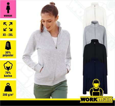 Popis: Dámska mikina celozapínacia so stojáčikom, jemný kvalitný úplet, rebrované elastické patenty na rukávoch a spodnej časti. 2 predné vrecká, výstužná jersey lemovka za krkom, celozapínací krytý zips pre lepší tlačový proces.