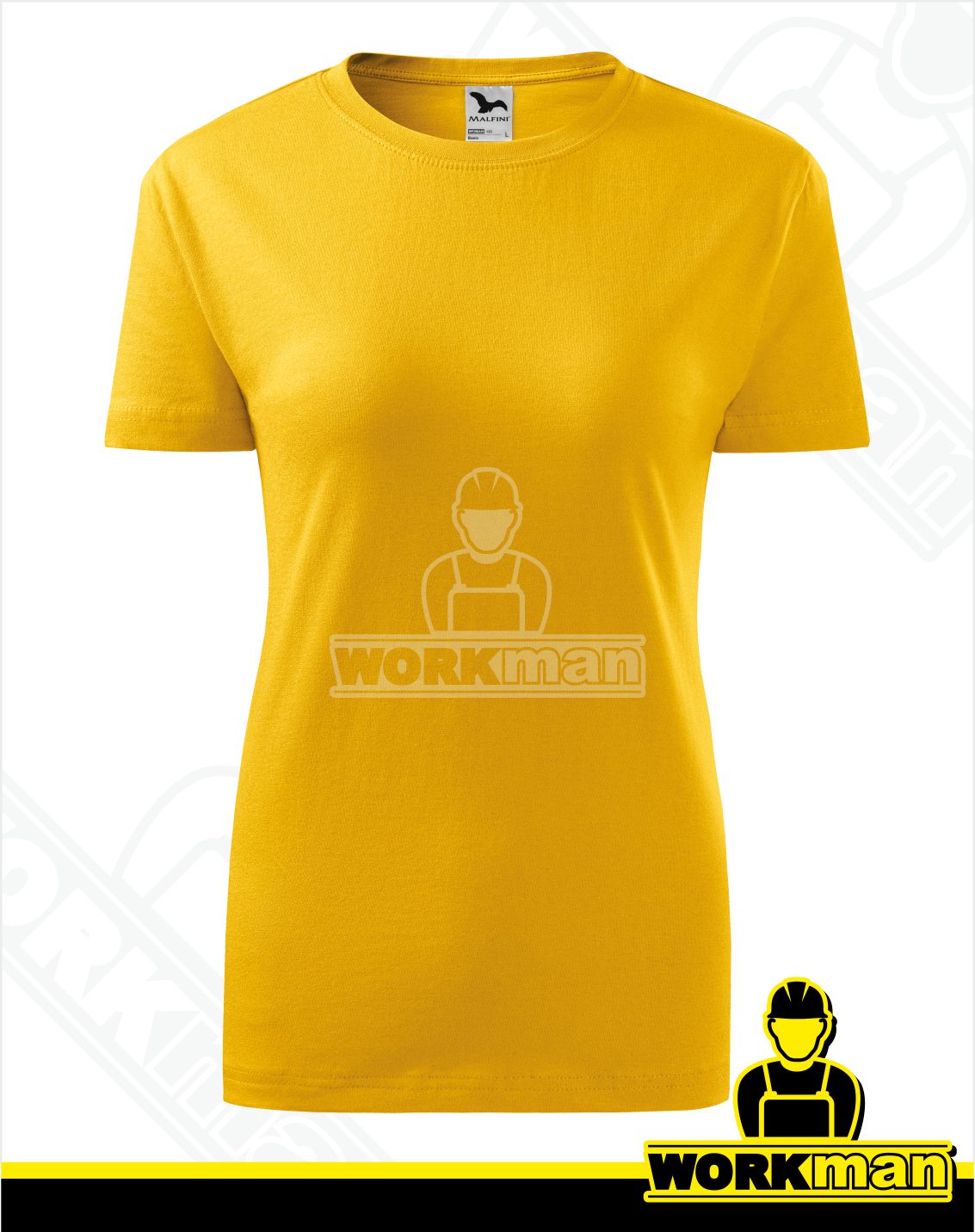Popis: Kvalitné dámske tričko nižšej gramáže. Zúžený strih zvýrazňujúci dámsku siluetu. Úzky lem priekrčníku z rebrového úpletu. Vnútorná časť zadného priekrčníku začistená tkanou páskou. Spevňujúci ramenný šev. Doplňuje pánsku a detskú variatnu trička Classic New.