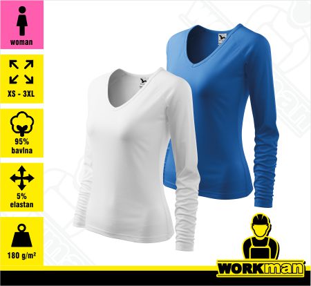 Popis: Kvalitné dámske tričko vysokej gramáže. Priekrčník v tvare V. Dlhý raglánový rukáv. Zúžený strih zvýrazňujúci dámsku siluetu. Vďaka prídavku elastanu drží tvar.