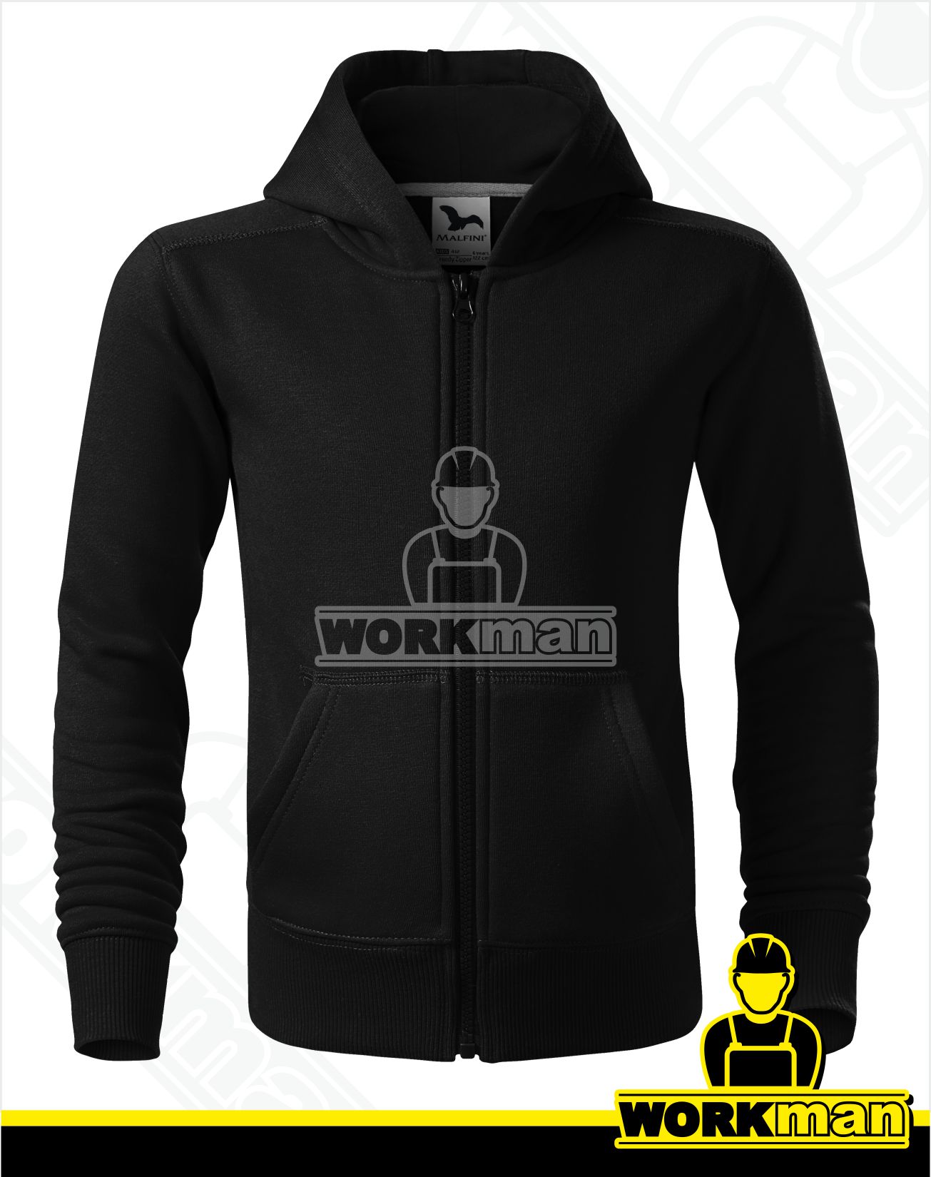 Popis: Detská celozapínacia mikina. Kapucňa s podšívkou bez sťahovacej šnúrky. Nakladané vrecká v štýle klokanky na prednom diele. Spodný lem a manžety rukávou z rebrového úpletu 2:2 s 5 % elastanu. Sedlá a vrecká s dekoratívnym prešitím. Vnútorná časť priekrčníka začistená tkanou páskou.