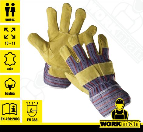 Popis: Dlaň zo žltej hovädzej štiepenky, chrbát a manžeta z pruhovanej bavlnenej tkaniny, podšívka na dlani.