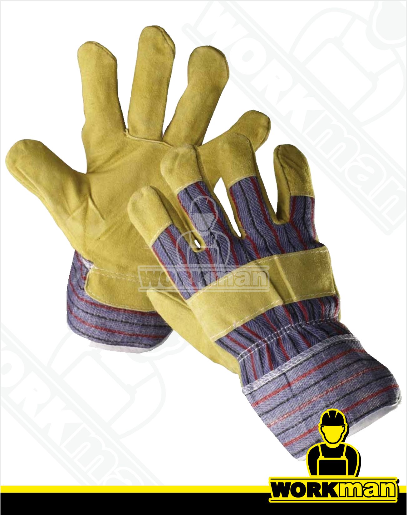 Popis: Dlaň zo žltej hovädzej štiepenky, chrbát a manžeta z pruhovanej bavlnenej tkaniny, podšívka na dlani.