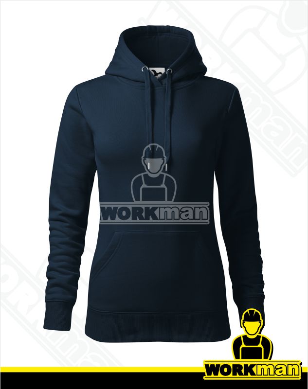 Popis: Dámska mikina s kapucňou. Nakladané vrecká v štýle klokanky na prednom diele. Kapucňa s podšívkou, na stiahnutie šnúrkou. Spodný lem a manžety rukávou z rebrového úpletu 2:2 s 5 % elastanu. Vnútorná časť priekrčníka začistená tkanou páskou. Zúžený strih.