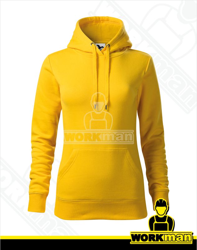 Popis: Dámska mikina s kapucňou. Nakladané vrecká v štýle klokanky na prednom diele. Kapucňa s podšívkou, na stiahnutie šnúrkou. Spodný lem a manžety rukávou z rebrového úpletu 2:2 s 5 % elastanu. Vnútorná časť priekrčníka začistená tkanou páskou. Zúžený strih.