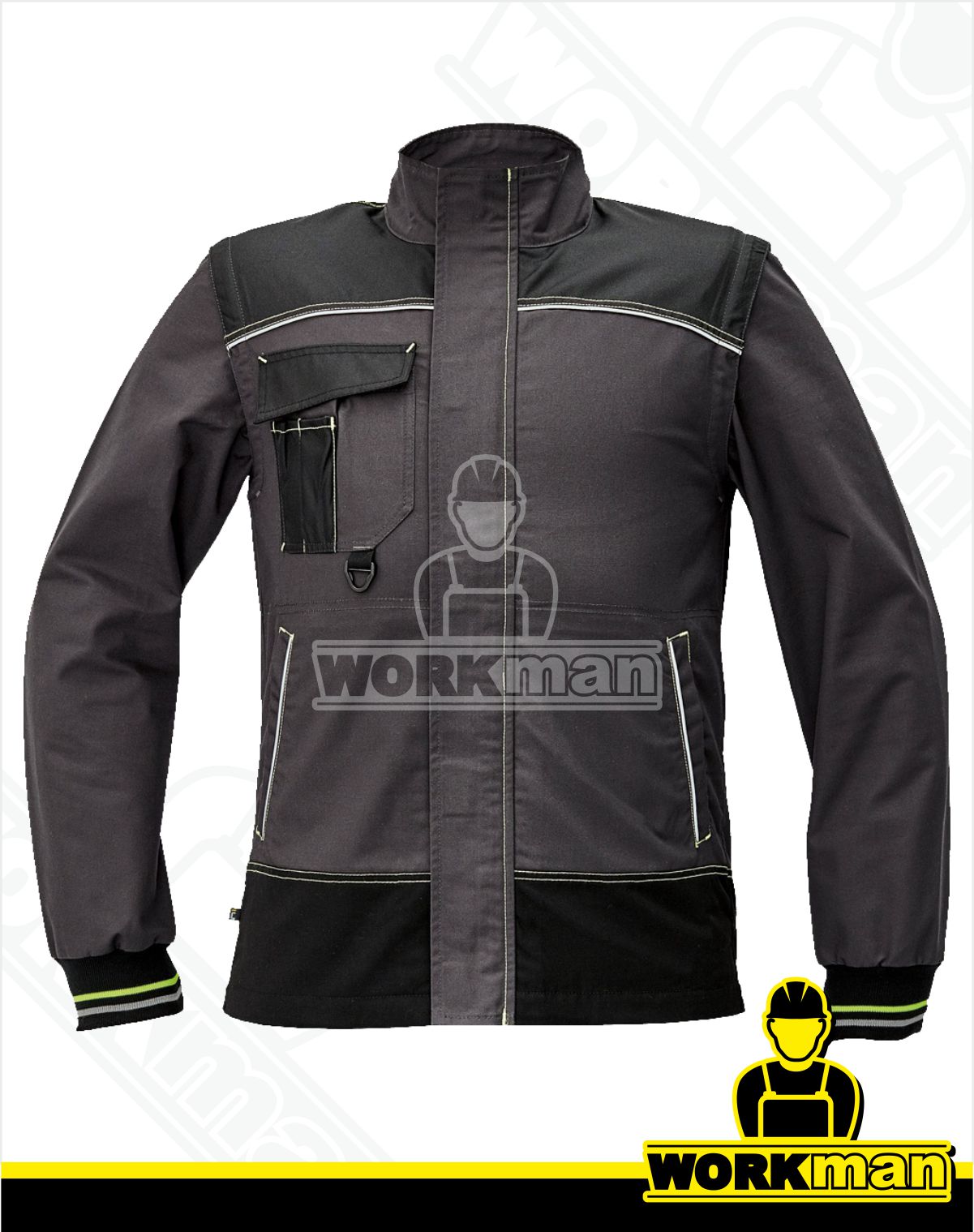 Popis: Pánska pracovná bunda moderného strihu so stojačikom. Bunda má odopínatelné rukávy, takže ju je možné použiť aj ako vestu.