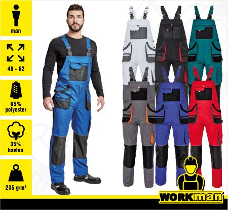 Popis: Nohavice s náprsenkou, s multifunkčnými vreckami, zosilnenie na kolenách s možnosťou vloženia nákolenníkov.