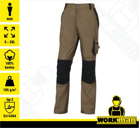 Popis: Pracovné nohavice. Elastická časť v páse a po stranách. Spevnené kolená. 6 vreciek, vrátane vrecka na meter.