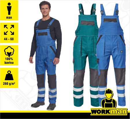 Popis: Pánske pracovné nohavice s náprsenkou a elastickým pásom. Inovovaná verzia klasickej kolekcie MAX s pridanými reflexnými pruhmi v spodnej časti rukávov, nohavíc a na zadnom diele bundy. Zaistí maximálnu bezpečnosť pri práci i za zníženej viditeľnosti.