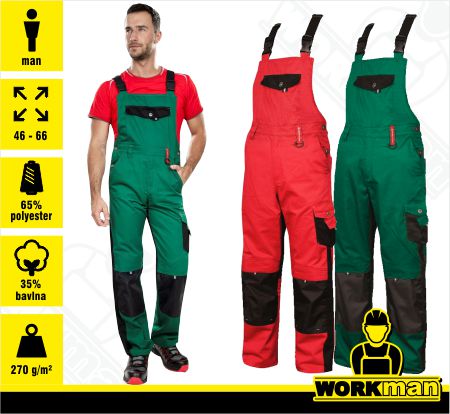 Popis: Montérkové nohavice s náprsenkou, zosilnenie kolien pomocou 300D polyester Oxford.