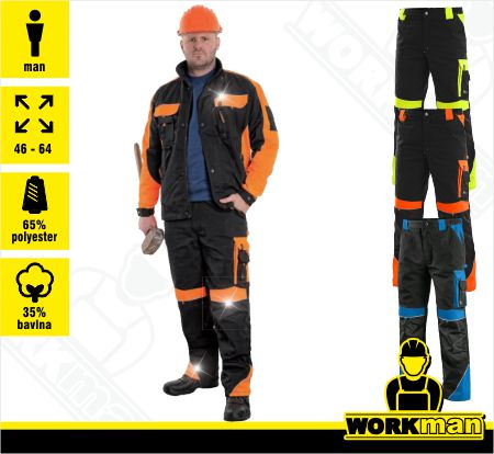 Materál: 65 % polyester 35 % bavlna, 270g/m2, spodná časťnohavícvystuženámateriálom600Dpolyester.