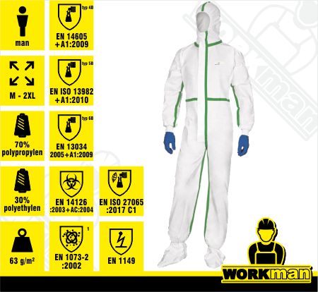Norma: EN ISO 13688:2013, EN14605:2005+A1:2009 typ 4B, EN ISO 13982-1:2004+A1:2010 typ 5B, EN13034:2005+A1:2009 typ 6B, EN14126:2003+AC:2004, EN1073-2:2002 trieda 1, EN1149-5:2018, EN ISO 27065:2017 C1