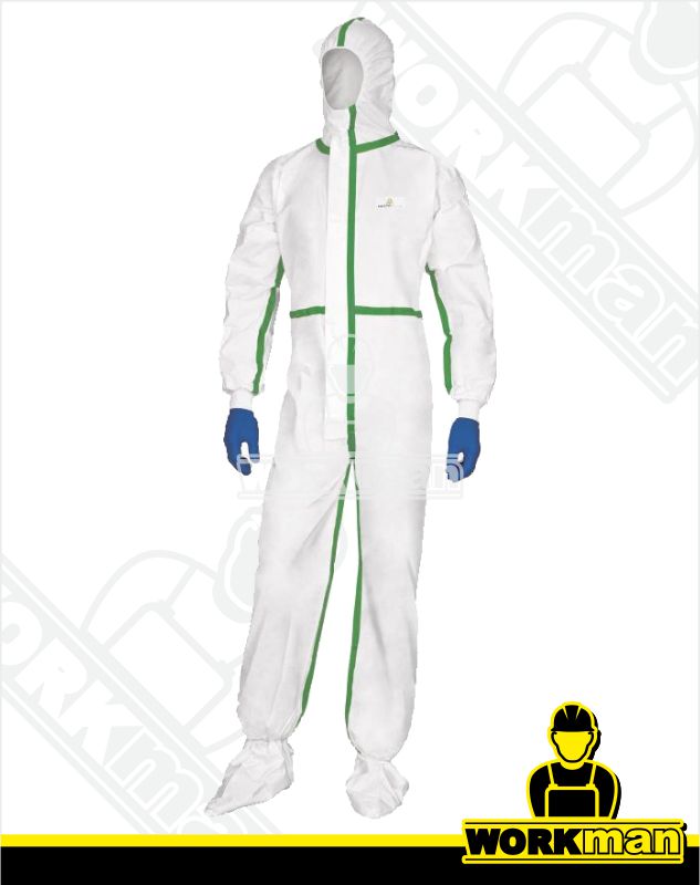 Popis: Kombinéza s elastickou kapucňou. Typ 4-B. Netkaný materiál Deltatek 5000 s mikroporéznou lamináciou. Obojstranný zips prekrytý lištou. Elastické sťahovanie v páse a členkoch. Zatavené švy, nešúpe sa a je bez silikónu. Polyetylénový film zabezpečuje vyššiu odolnosť pred chemickými látkami a pred mechanickým poškodením (oder, roztrhnutie). Úplet na zápästí. Antistatická. Jednorazová. Samostatne a vákuovo balené.
