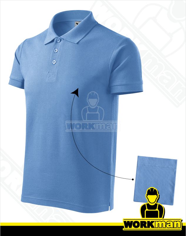 Popis: Pánska polokošeľa strednej gramáže. Strih s rozparkami v bočnom šve. Golierik a lemy rukávov z rebrového úpletu 1:1. Léga s 3 gombíčkami vo farbe materiálu. Vnútorný priekrčník začistený páskou z povrchového materiálu. Spevnenie ramenných švov páskou. Samostatné vrecko pre jednoduchší branding.