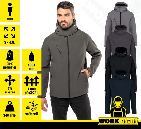 Popis: Technicky prepracovaná pánska 3 vrstvová softshellová bunda so sťahovacou odnímateľnou kapucňou. 3 vrstvy spojenej textílie softshell: Vonkajšia vodeodolná vrstva s elastanom, unikátna stredná performance priedušná membrána, vnútorná vrstva - tepelnoizolačné mikrofleece s úpravou proti plstnateniu. Priedušná až do 1000 g / m2 / 24h. Vodeodolná až do 5000 mm vodného stĺpca. Raglánové rukávy. Celoprepínací zips. Odnímateľná kapucňa sťahovateľná elastickou šnúrkou so zarážkou. 2 bočné vrecká na zips + 1 vrecko so zipsom vpravo na hrudi. Nastaviteľné manžety na suchý zips. V páse sťahovacia šnúrka.