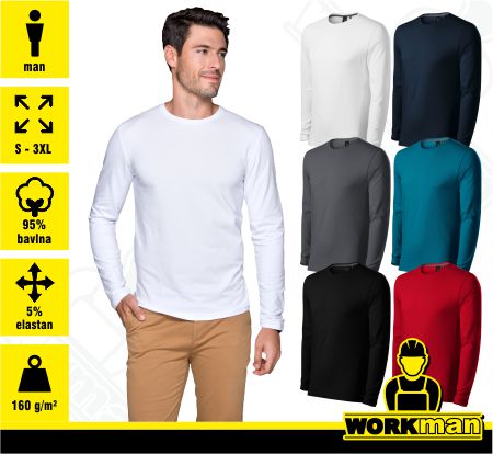 Popis: Pohodlné pánske tričko s dlhými rukávmi skvelo drží tvar vďaka prídavku 5 % elastanu. Strečový materiál udržujúci stálosť tvaru. Priliehavý strih s bočnými švami. Úzky lem priekrčníka z rebrového úpletu 1:1 s 5 % elastanu. Vnútorná časť priekrčníka začistená kontrastnou páskou. Spevnenie ramenných švov páskou. Dlhé rukávy.