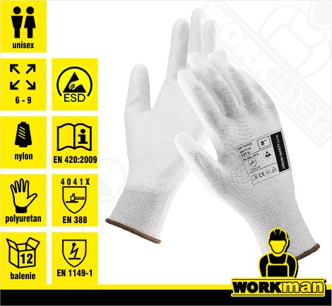 Popis: ESD povrstvené pracovné rukavice pre všeobecnú manipuláciu. Povrchový odpor úpletu 3,2 x 107 Ohm.
