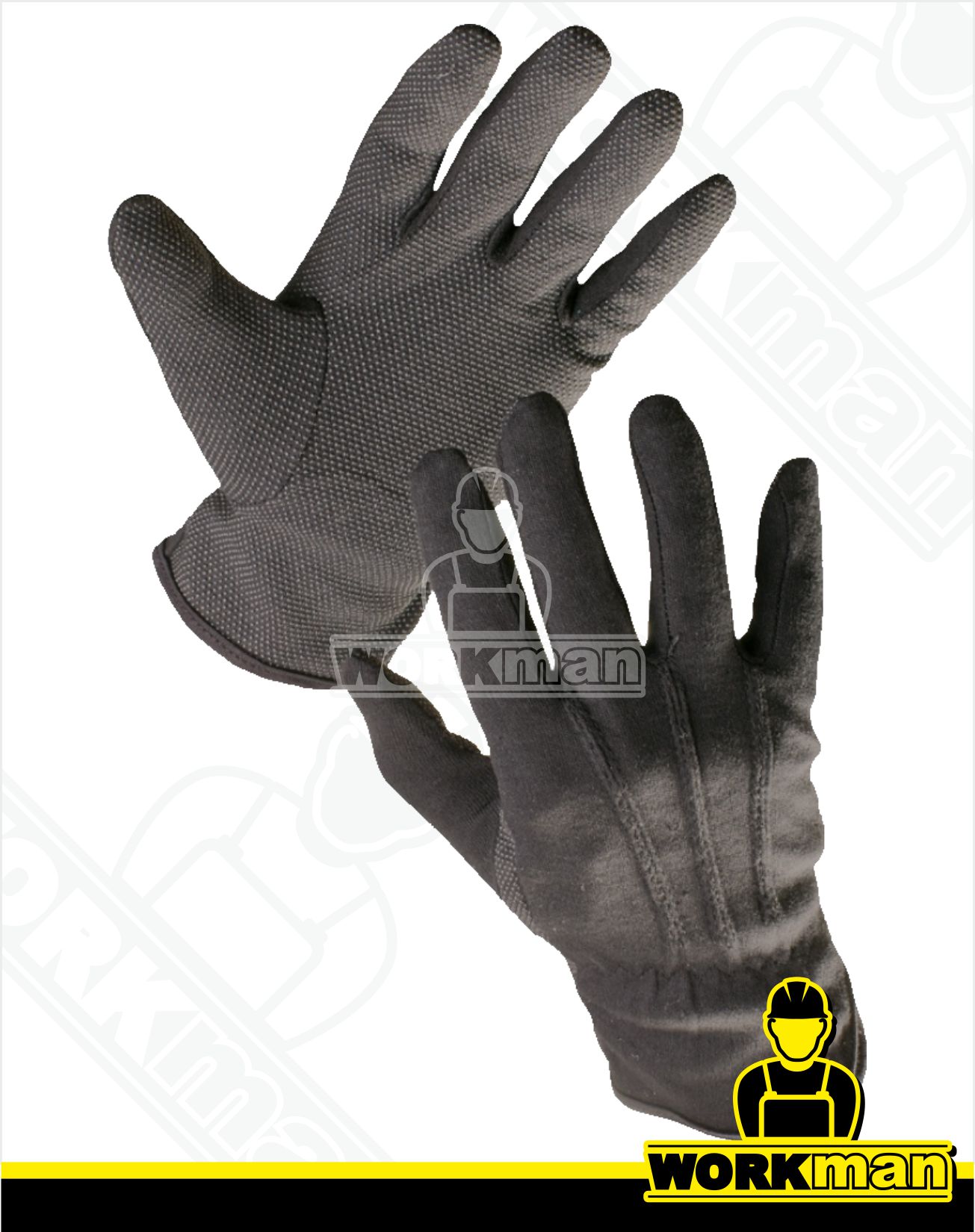Popis: Rukavice šité z bavlneného úpletu, s PVC terčíkmi v dlani a na prstoch, pružinkou na hornej časti zápästia, bez manžety.