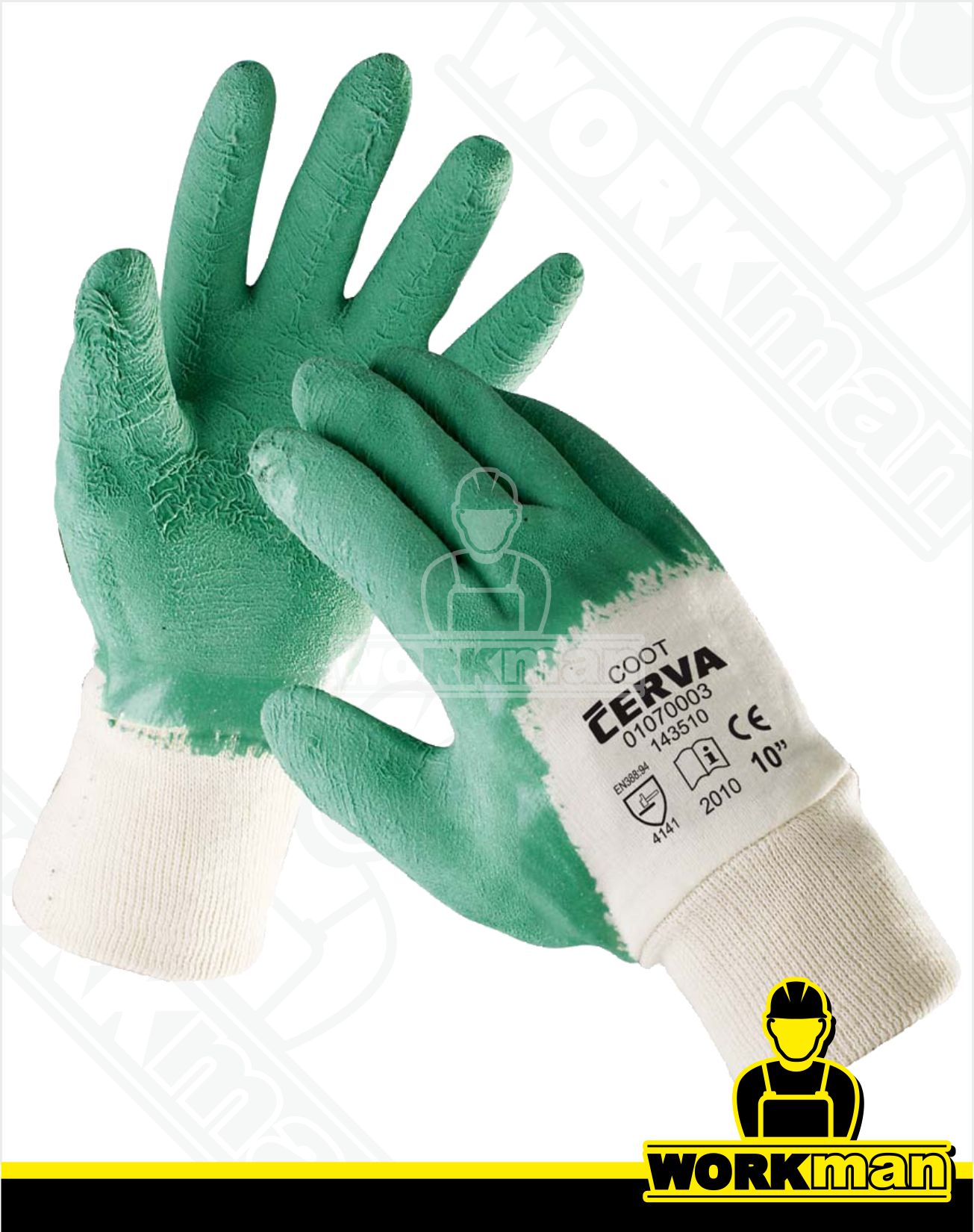 Popis: Zelené rukavice šité z bavlneného úpletu, s protišmykovým povrchom, pružným nápletom na zápästí a máčanými dlaňami a prstami v kaučuku.