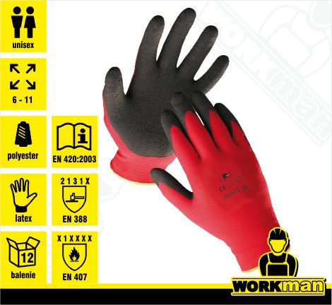 Popis: Pletené bezšvové polyesterové rukavice, máčané v čiernom latexe na dlani a na prstoch, pružná manžeta.