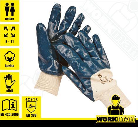 Popis: Rukavice šité z bavlneného úpletu, polomáčané, s hrubšou vrstvou nitrilu (protišmykové uchopenie) s elastickou pletenou manžetou zabraňujúcou prieniku nečistôt. Určené sú pre prácu s abrazívnymi materiálmi v silno zaolejovanom prostredí.