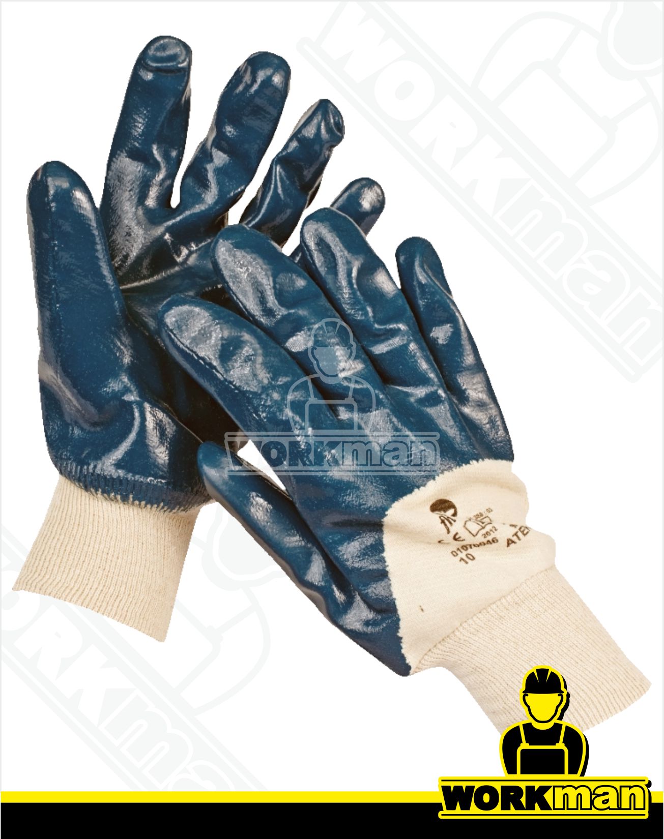 Popis: Rukavice šité z bavlneného úpletu, polomáčané, s hrubšou vrstvou nitrilu (protišmykové uchopenie) s elastickou pletenou manžetou zabraňujúcou prieniku nečistôt. Určené sú pre prácu s abrazívnymi materiálmi v silno zaolejovanom prostredí.