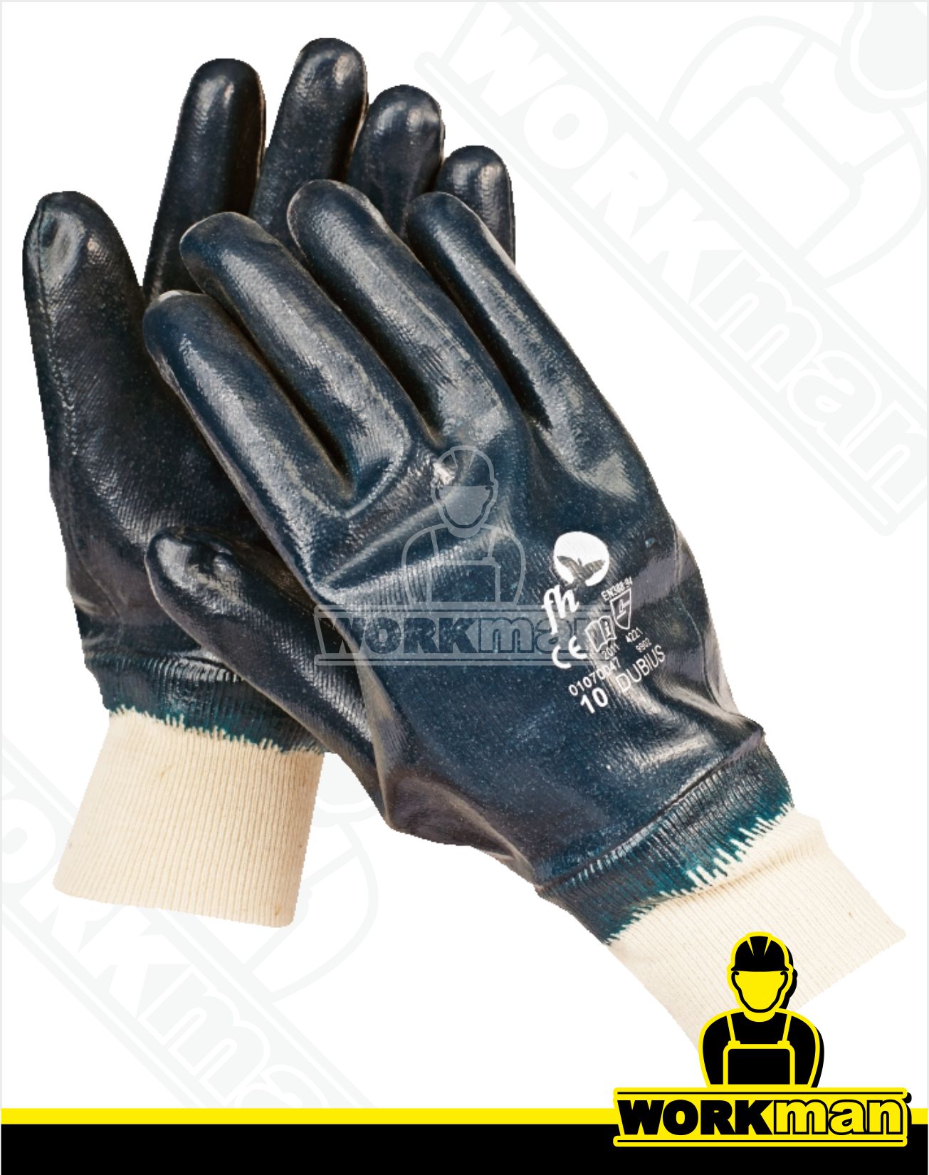 Popis: Rukavice šité z bavlneného úpletu, máčané, so silnejšou vrstvou nitrilu (protišmykové uchopenie) s elastickou pletenou manžetou zabraňujúcou prieniku nečistôt. Určené sú pre prácu s abrazívnymi materiálmi v silno zaolejovanom prostredí.