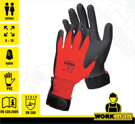 Kompletné špecifikácie Povrstvené rukavice JACDAW Červa Popis: Pletené, bezšvové, nylonové rukavice (15GG), s nánosom HPT PVC v dlani a na prstoch a pružnou manžetou na suchý zips. Farba: červená/čierna Veľkosť: 6, 7, 8, 9, 10 Materál: Nylon. Nános - dlaň a prsty: HCT PVC. Použitie: Vhodná pre všeob... celý popis