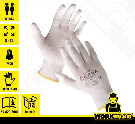 Popis: Pletené, bezšvové, nylonové, rukavice s tenkou vrstvou polyuretánu na špičkách prstov a pružnou manžetou.