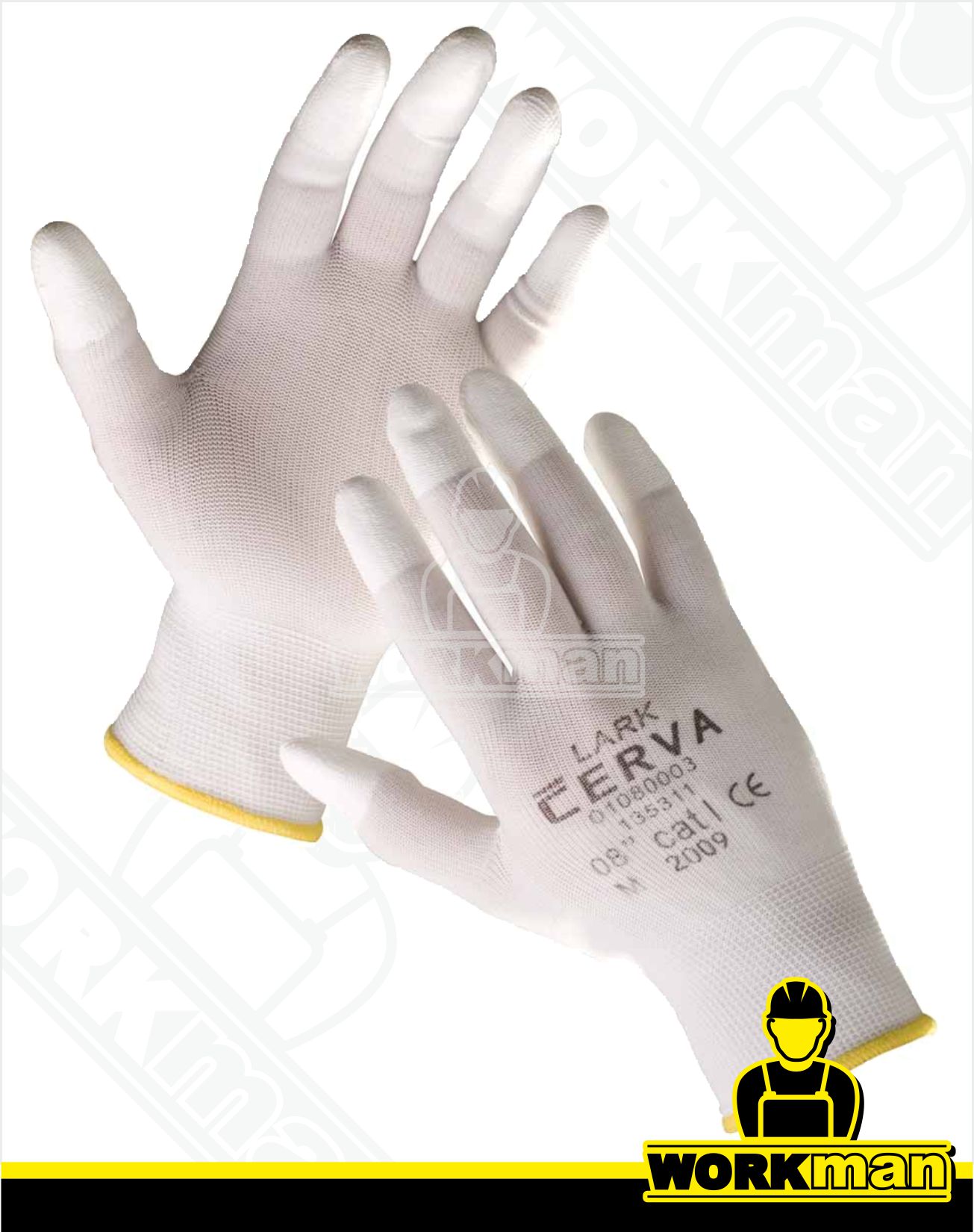 Popis: Pletené, bezšvové, nylonové, rukavice s tenkou vrstvou polyuretánu na špičkách prstov a pružnou manžetou.