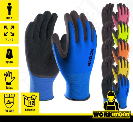Popis: Bezšvové nylonové rukavice s vrstvou mikorporezného latexu v dlani a na prstoch a pružným nápletom na zápästí. Polomáčané - priedušné. Každá veľkosť má svoju špecifickú farbu.