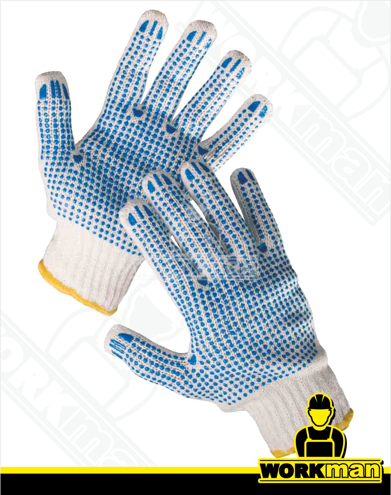 Popis: Pletené bezšvové obojstranné rukavice zo zmesi polyester/bavlna s PVC terčíkmi a pružným nápletom na zápästí.