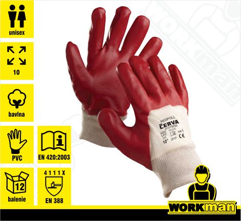 Popis: Červené rukavice šité z bavlneného úpletu, polomáčané v PVC, s pružným nápletom.