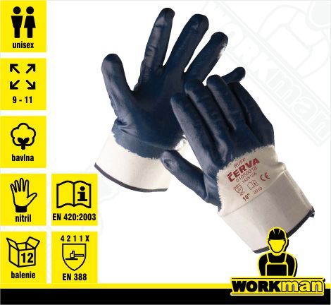 Popis: Modré rukavice šité z bavlneného úpletu, polomáčané v nitrile, s pevnou manžetou.