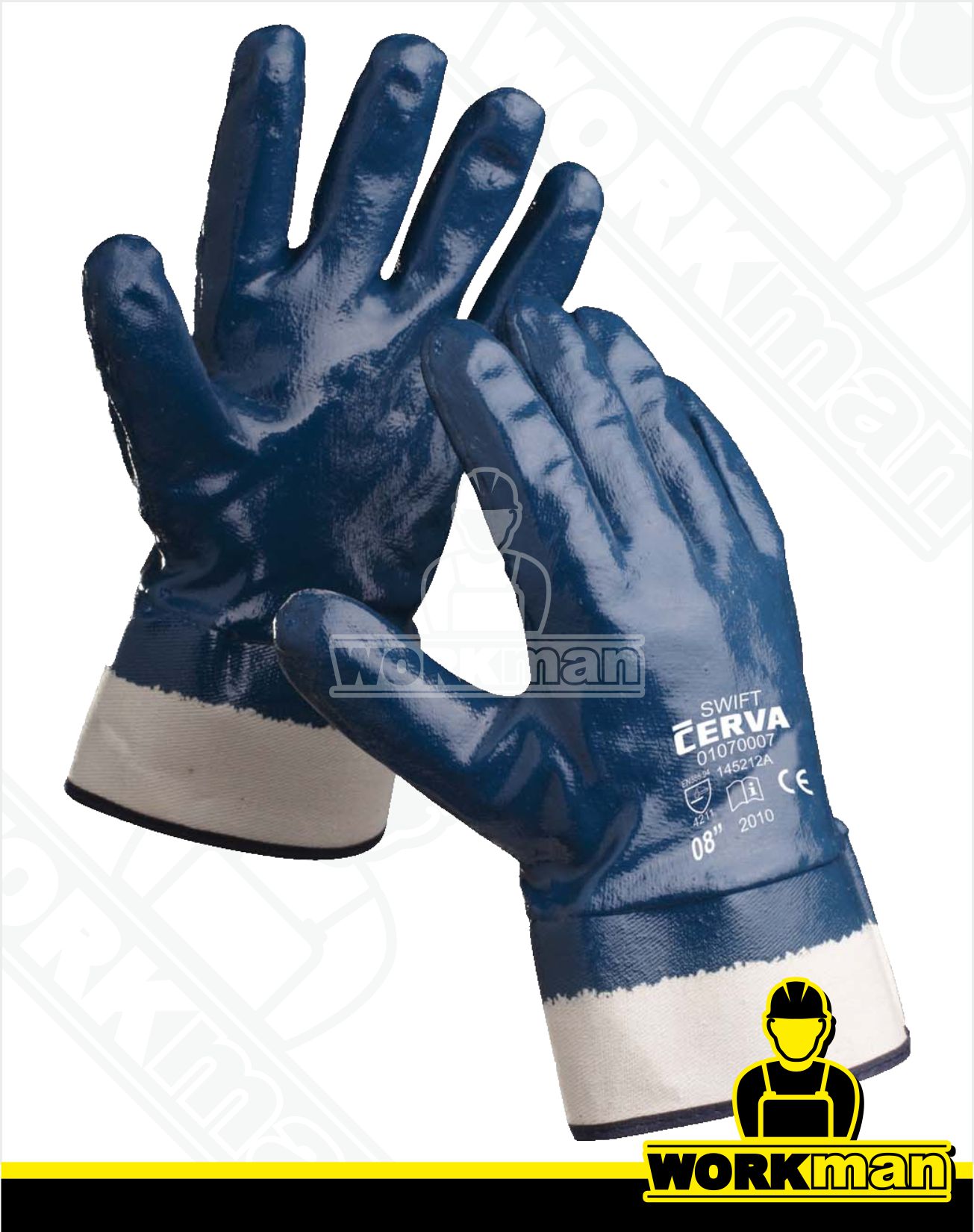 Popis: Rukavice šité z bavlněného úpletu, celomáčené v nitrilu, s tuhou manžetou.