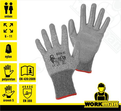 Popis: Protiporezové pracovné rukavice, bezšvový úplet z vlákien HPPE, 43% 400D UHMWPE + 9% 140D elastan (100D Spandex) + 15% 140D Nylon + 11% 100D Glass Fibre + 22% 100D Polyester dlaň a prsty máčané v polyuretáne. Odolnosť proti porezu 5.