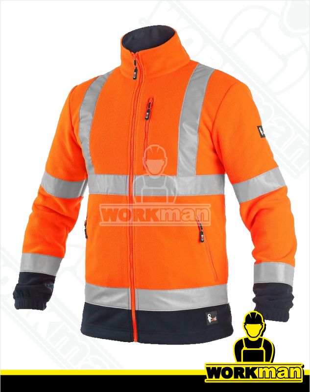 Popis: Výstražná fleecová bunda na zips s reflexnými pruhmi, s podšívkou. Hlavicové rukávy ukončené do gumy, možnost utiahnutia v dolnej časti bundy, fleecový límec, dve spodné vrecká na zips.