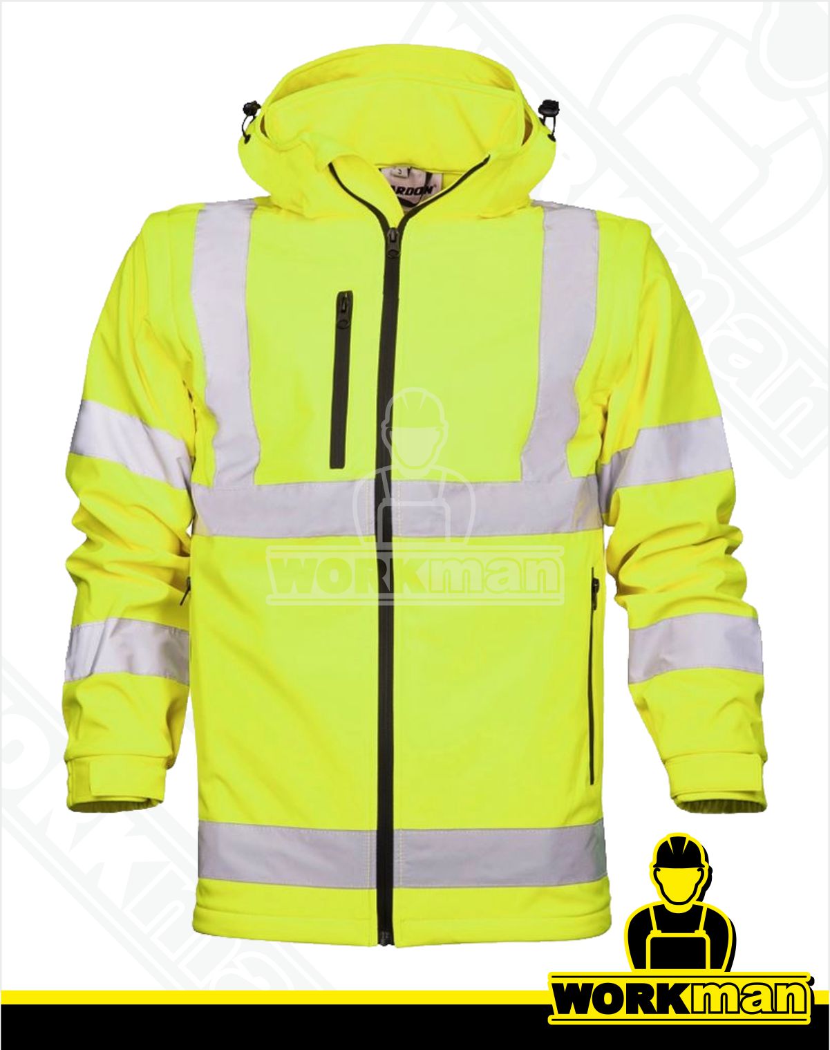Popis: Softshellová bunda s odopínateľnou kapucňou. Reflexné pruhy: 2 horizontálne, 2 vertikálne, 2 na rukávoch. S TPU membránou, vodoodolnosť 5 000 mm, vodoodpudivosť 3 000 g/m²/24 h.