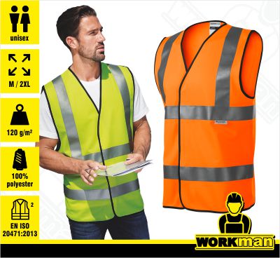 Popis: Výstražná vesta s vysokou viditeľnosťou. Zapínanie na suché zipsy v strede predného dielu. Odev certifikovaný podľa normy EN ISO 20 471:2013 - odevy s vysokou viditeľnosťou (trieda 2). Odev certifikovaný podľa normy EN ISO 13688:2013 - ochranné odevy.
