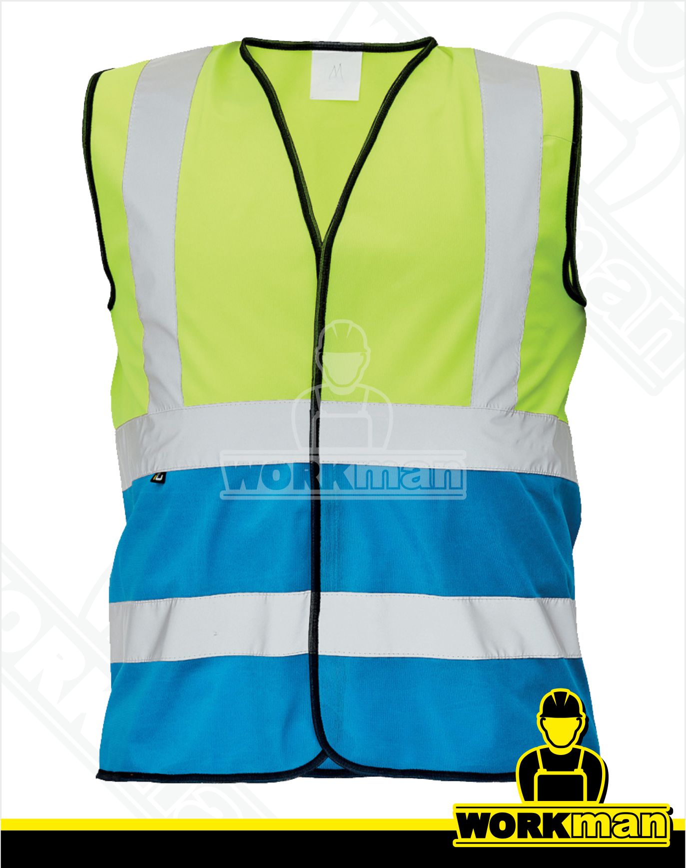 Popis: Reflexná vesta s rôznofarebným prevedením spodnej časti. K noseniu cez vrchný odev. Zapínanie na suchý zips. Je vybavená dvoma horizontálnymi a dvoma vertikálnymi retroreflexnými pásmi.