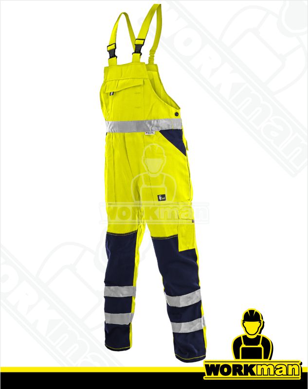 Popis: Pánske nohavice s náprsenkou, výstražné, v zadnej časti pásu guma na stiahnutie, našité vrecko na náprsence s vreckom na ceruzku, predné a zadné našité vrecká, bočné vrecko s vreckom na mobil, reflexné pruhy 3M.