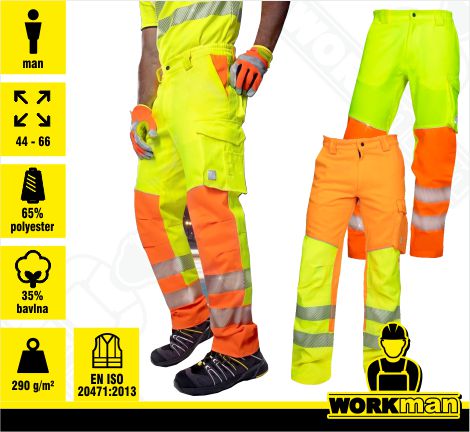 Popis: Montérkové nohavice do pásu. Dĺžka na postavu 176-182 cm. Vďaka ergonomicky tvarovanému štíhlemu strihu skvele padnú. Pevná keprová tkanina má výborné mechanické vlastnosti a vysokú odolnosť v ťahu a proti pretrhnutiu. Pružný pásový golier s integrovanou gumou zvyšuje komfort nosenia. 2 predné vrecká, 2 zadné vrecká kryté pätkami. Veľké vrecko na ľavej nohavici kryté pätkou. Vrecko na odlamovací nôž, skrutkovač a tesárske ceruzky. Na pravej nohavici vrecko na skladací meter, skrutkovač a odlamovací nôž. Zdvojené partie v oblasti kolien. Reflexné paspule na prednom a zadnom diele pre vyššiu viditeľnosť. 2 segmentované reflexné pásky na prednom dieli, 2 na zadnom diele.