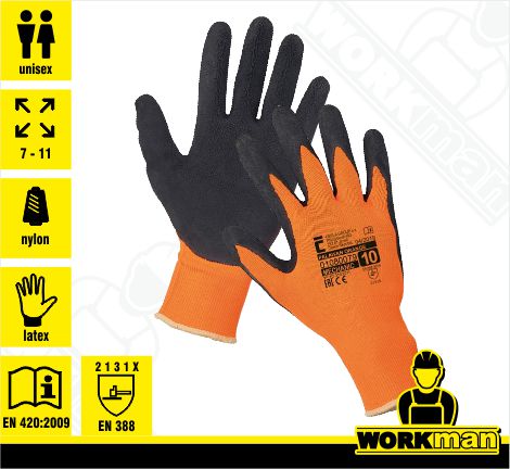 Popis: Pätprstové bezošvé nylonové pletené rukavice na dlani a prstoch povrstvené latexom a pružným nápletom na zápästí. Nepoužívať, pokiaľ je vyžadovaná ochrana zápästia.