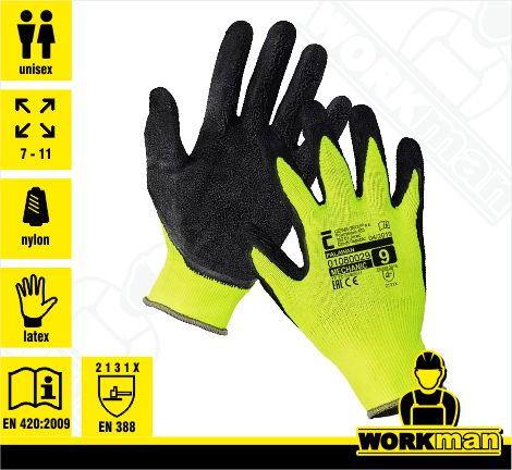 Popis: Pätprstové bezošvé nylonové pletené rukavice na dlani a prstoch povrstvené latexom a pružným nápletom na zápästí. Nepoužívať, pokiaľ je vyžadovaná ochrana zápästia.